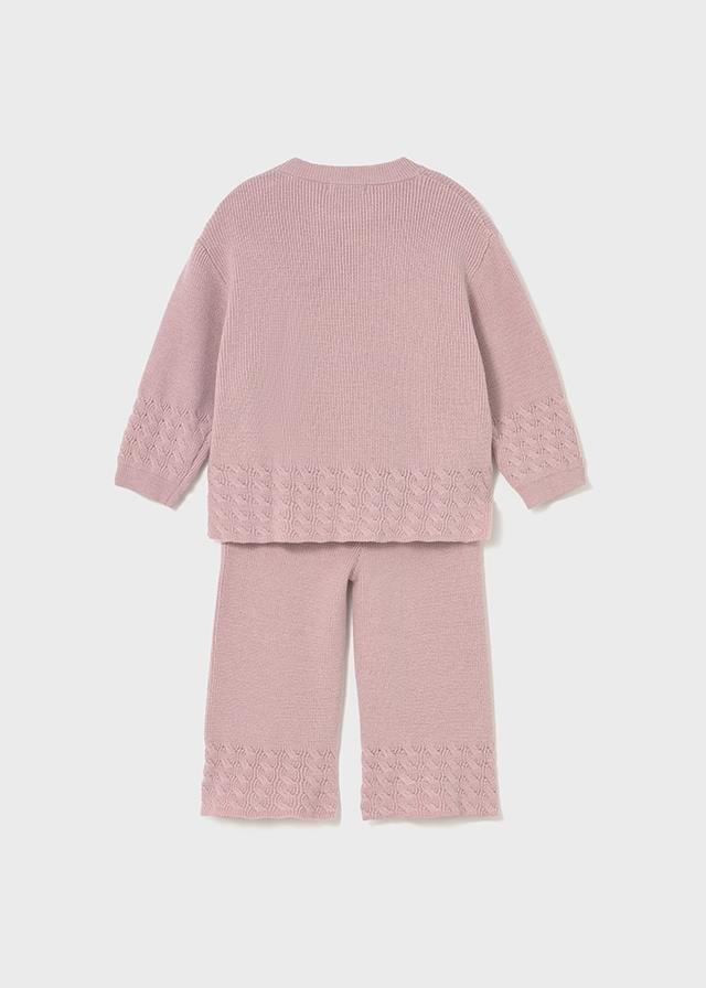 Bebek için uyumlu kazak ve pantolon takımı. Örme kumaş, yumuşak ve dokunuşu hoş.