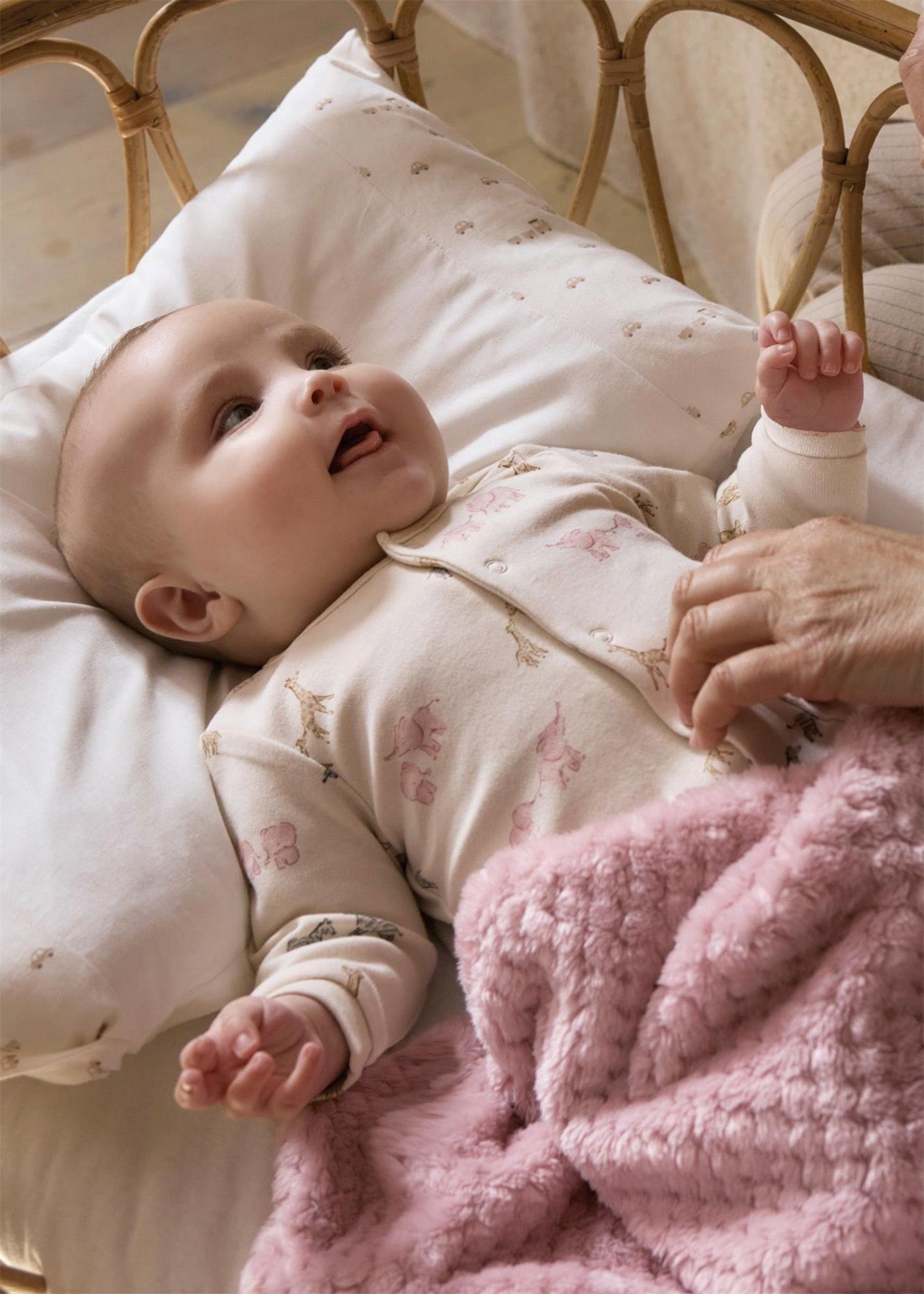 Yenidoğan kız bebek için tek parça. Yuvarlak yaka. Önde çıtçıtlı düğme. Kolay giydirme için ağ kısmında çıtçıtlı düğme. Desenli tasarım.