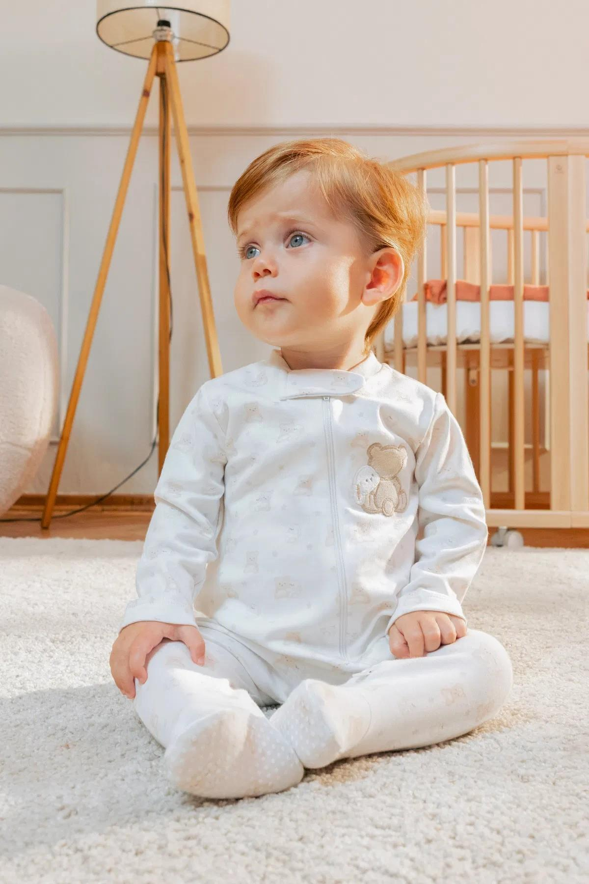 Uyku, oyun ve dinlenme vakitlerinde konfor arıyorsanız bu tulum tam minik bebeğinize göre! Ekru rengi sayesinde hem kız hem de erkek bebeklerin kullanımına uygun olan bu tulum, yumuşacık kumaşı ve uzun kollu tasarımıyla serin havalarda kullanmak için mükemmeldir. Kendinden patikli tasarım sizi çorap derdinden kurtarırken miniklerin ayakları sıcacık kalır. Yuvarlak yakası ve rahat kalıbıyla uyku saatinden oyun etkinliklerine kadar tüm gün konfor sunmak üzere tasarlanmıştır. Boydan boya sevimli deseniyle göz dolduran tulumun sol kısmında şirin bir tavşan ve ayıcık figürü bulunur. V yakalıdır. Boyundan başlayıp ayağa kadar uzanan tam boy fermuar kapamalı model bez ve kıyafet değişimlerini pratik hale getirir.