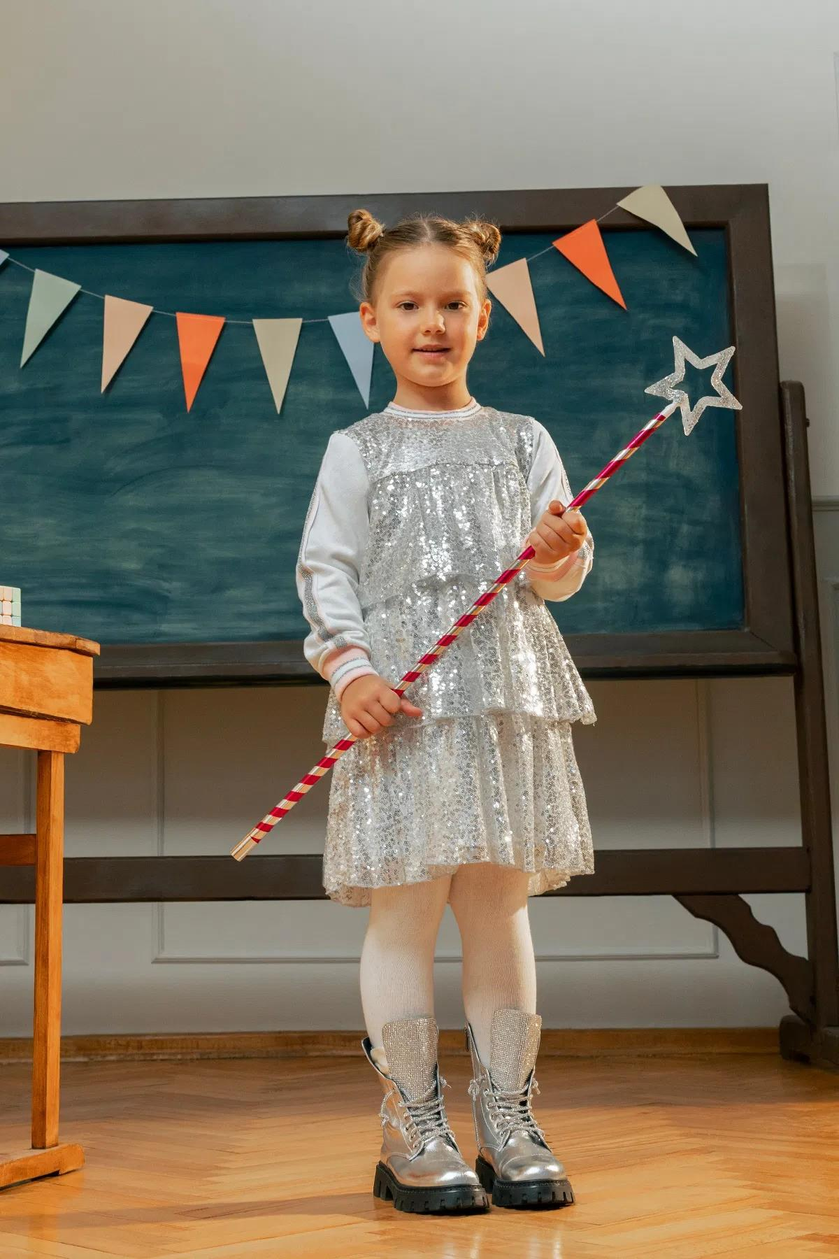 Miniklerin gardırobuna ışıltıyı davet eden Pul Payetli Elbise, oldukça göz kamaştırıcı. Kolları ve yakasıyla sade bir şıklık sunarken geri kalan kısmıyla her adımda parıltıyı hissettiren elbise, miniklerin attığı her adımı daha özel kılar. Gri payetler, sayesinde minik prensesiniz göz alıcı bir ışıltı yayar. 2-6 yaş arası beden seçenekleri bulunan elbiseyi, özel davetlerde ya da günlük kullanımlarda kombinleyebilir